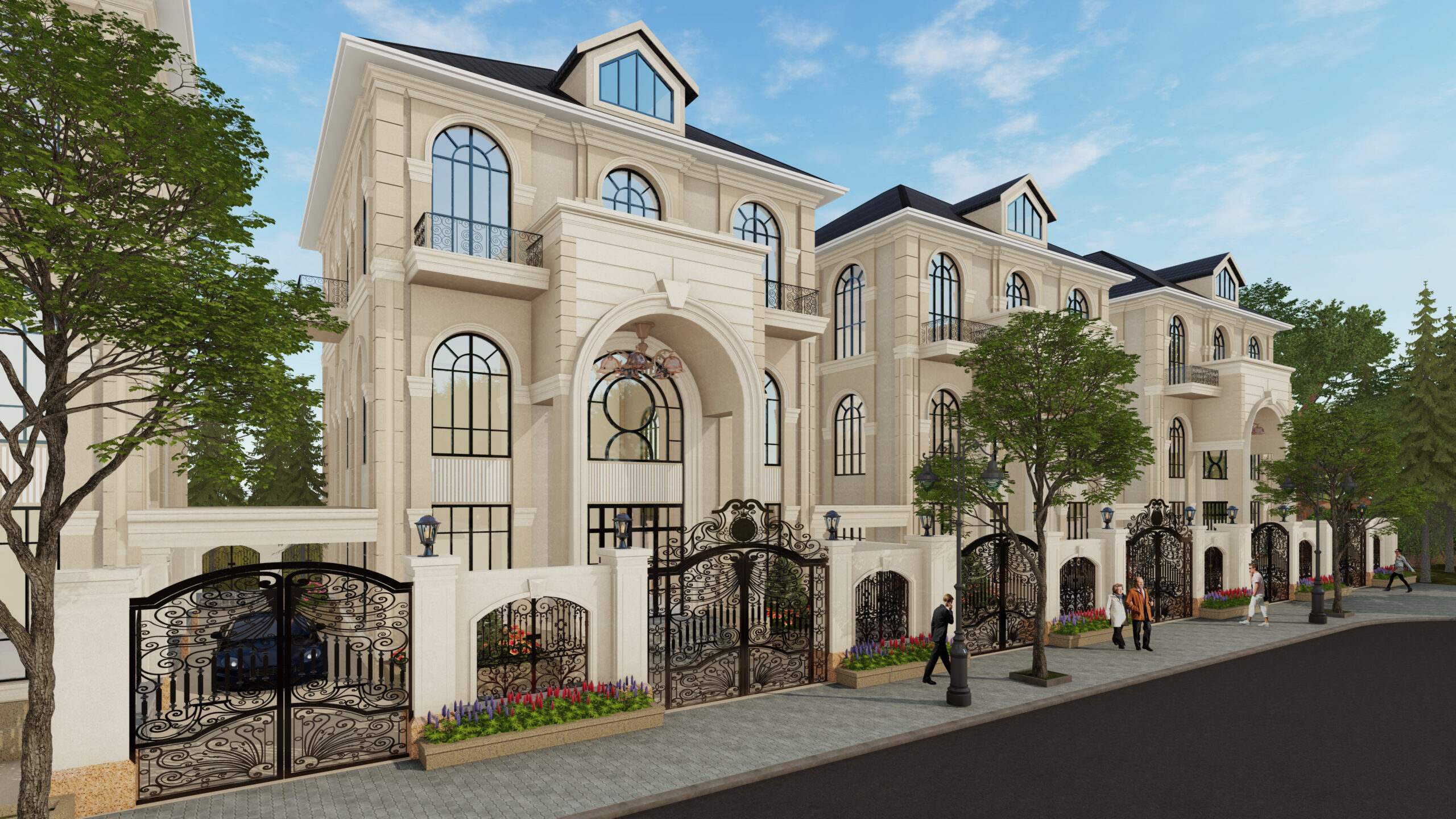 Ngôn ngữ Tân cổ điển (Neo-Classical) tại đây được thể hiện xuyên suốt — từ mặt đứng các căn biệt thự đơn lập, song lập cho đến dãy nhà phố và shophouse thương mại. Mỗi dòng sản phẩm đều được thiết kế với đường nét mái vòm, cột trụ trang trí, ban công sắt uốn và gam màu trung tính đặc trưng của kiến trúc Haussmann — phong cách đã định hình diện mạo Paris suốt hơn 150 năm qua.